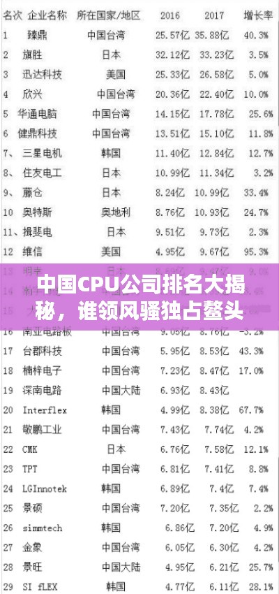 是中国CPU公司的排名,这些公司在研发实力、产品线、市场表现等方面均表现出色,随着科技的不断发展,中国CPU市场将迎来更多的机遇和挑战,这些公司将继续发挥自身优势,加强技术研发和创新,提升中国CPU产业的竞争力。